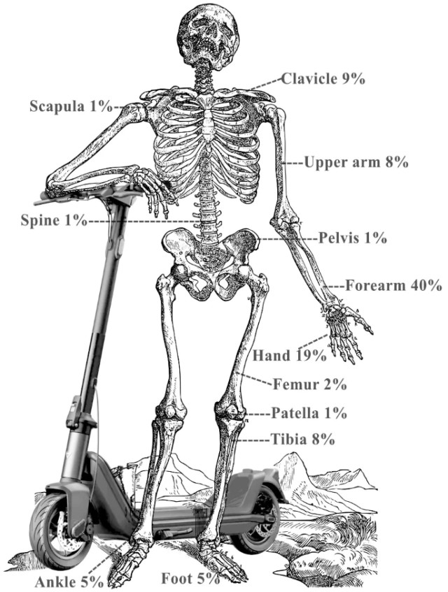Hernefalk med medarbetare har tittat på en period av 3,5 år och funnit 1,874 frakturer ur SFR, uppkomna i samband med elsparkcykelolyckor. De drabbar företrädelsevis övre extremiteterna. 30% av skadorna kräver operation.