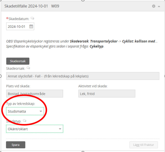 Studsmatta - Nytt val under skadeorsak2024-10-01Från och med idag har vi lagt till ett nytt val under fall från lekredskap, nu kan vi specificera skador på studsmatta.